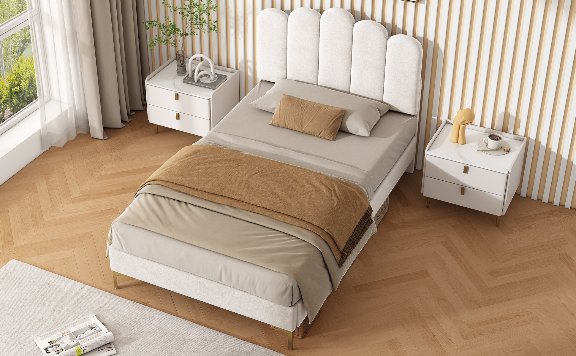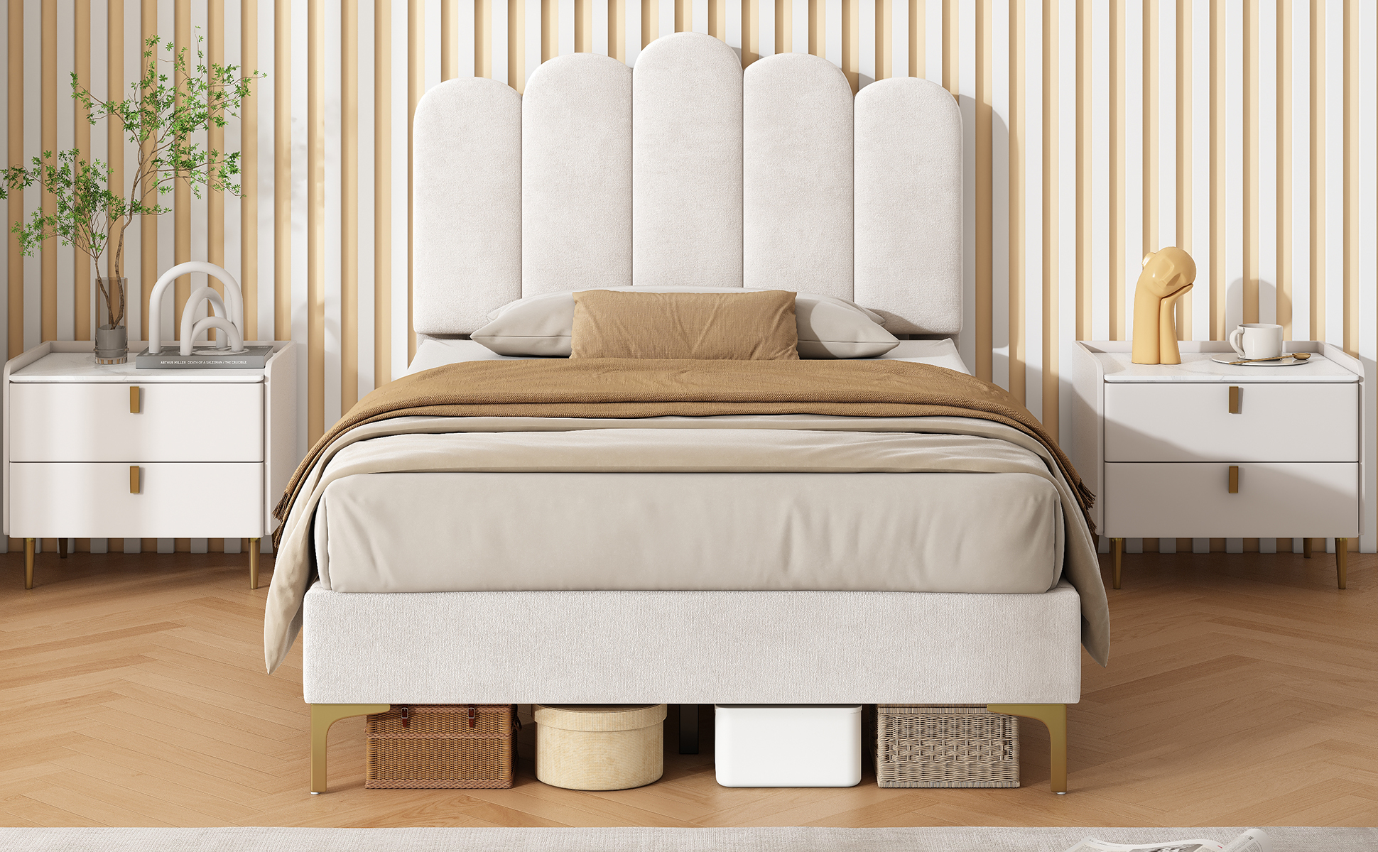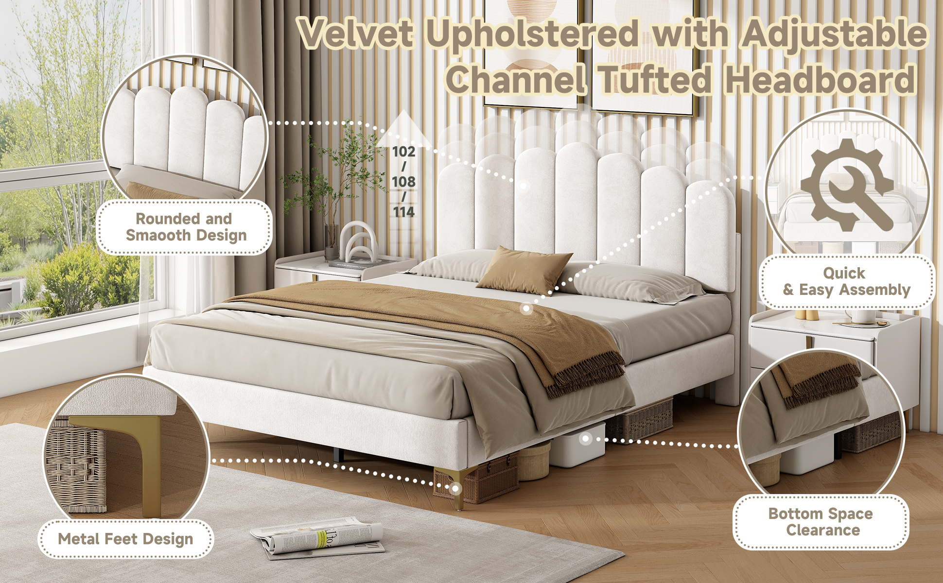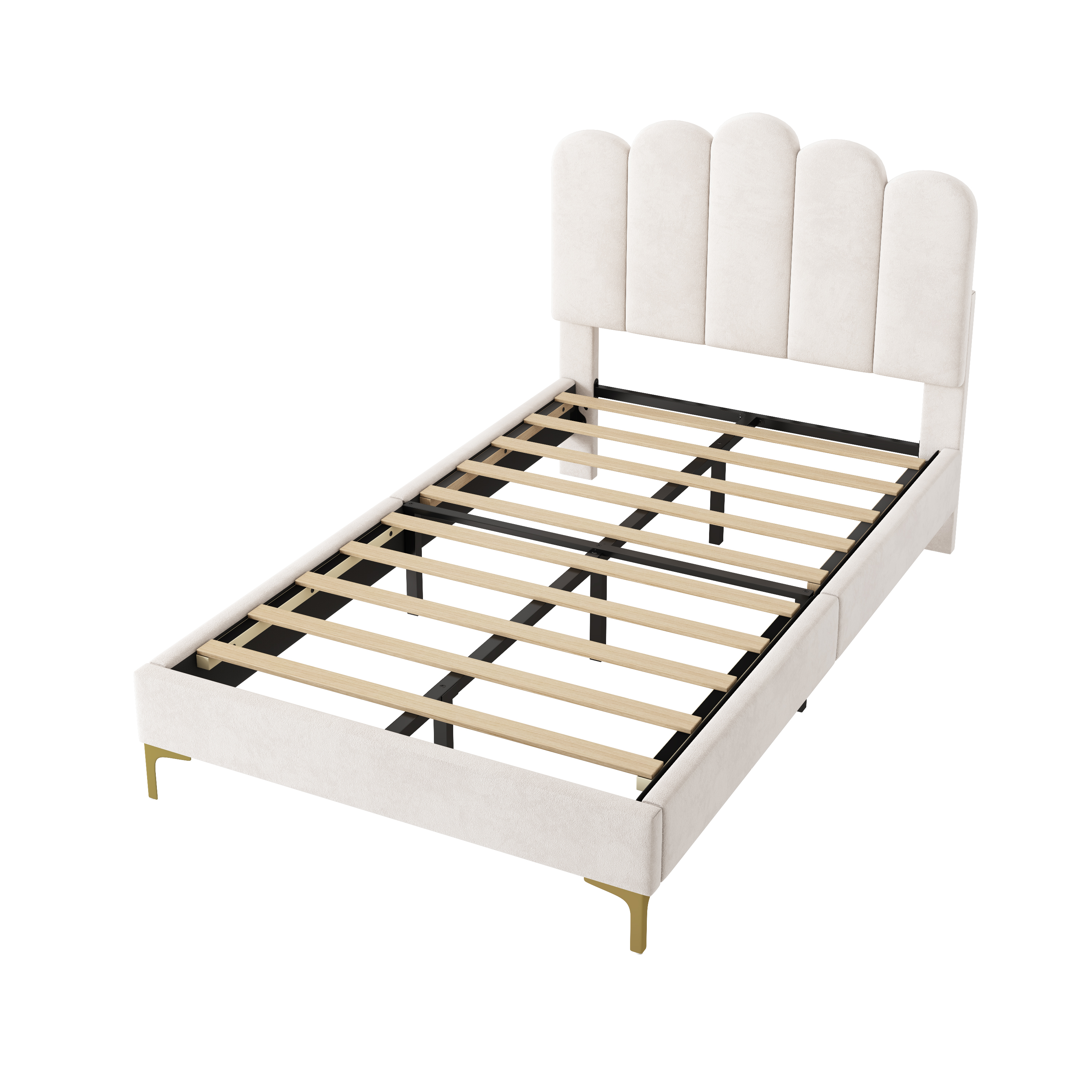 Product Name:3ft Single Premium Velvet Upholstered Bed Frame with Scalloped Channel Tufted Design, Height Adjustable Headboard & Gold Metal Feet, Under-bed Storage Space, No Box Spring Needed, Beige (No Mattress)