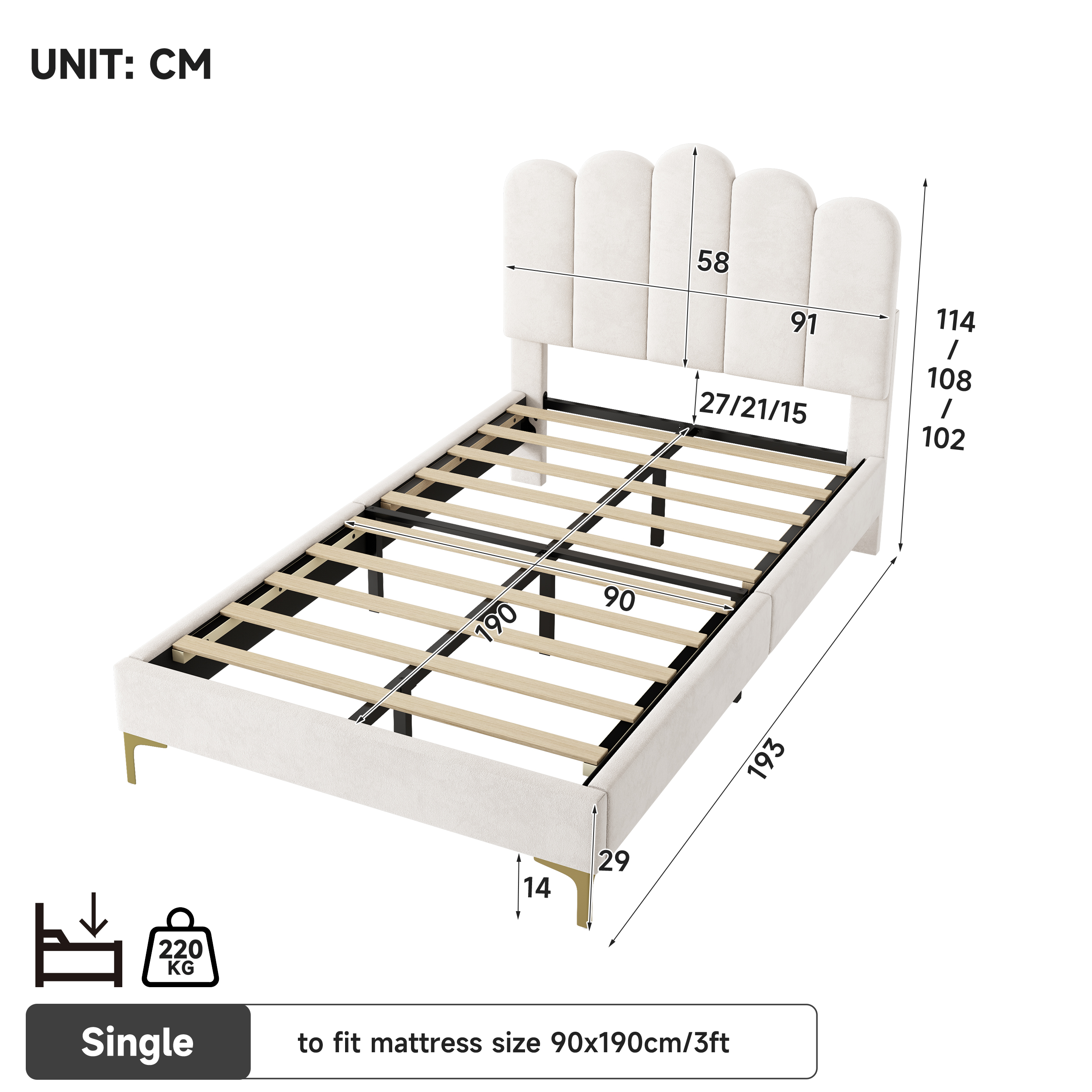 3ft Single Premium Velvet Upholstered Bed Frame With Scalloped Channel Tufted Design, Height Adjustable Headboard & Gold Metal Feet, Under-bed Storage Space, No Box Spring Needed, Beige No Mattress